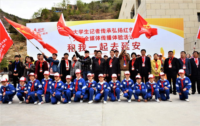 参加“和我一起去延安”启动仪式的领导与全国大学生记者和延安小学生代表合影